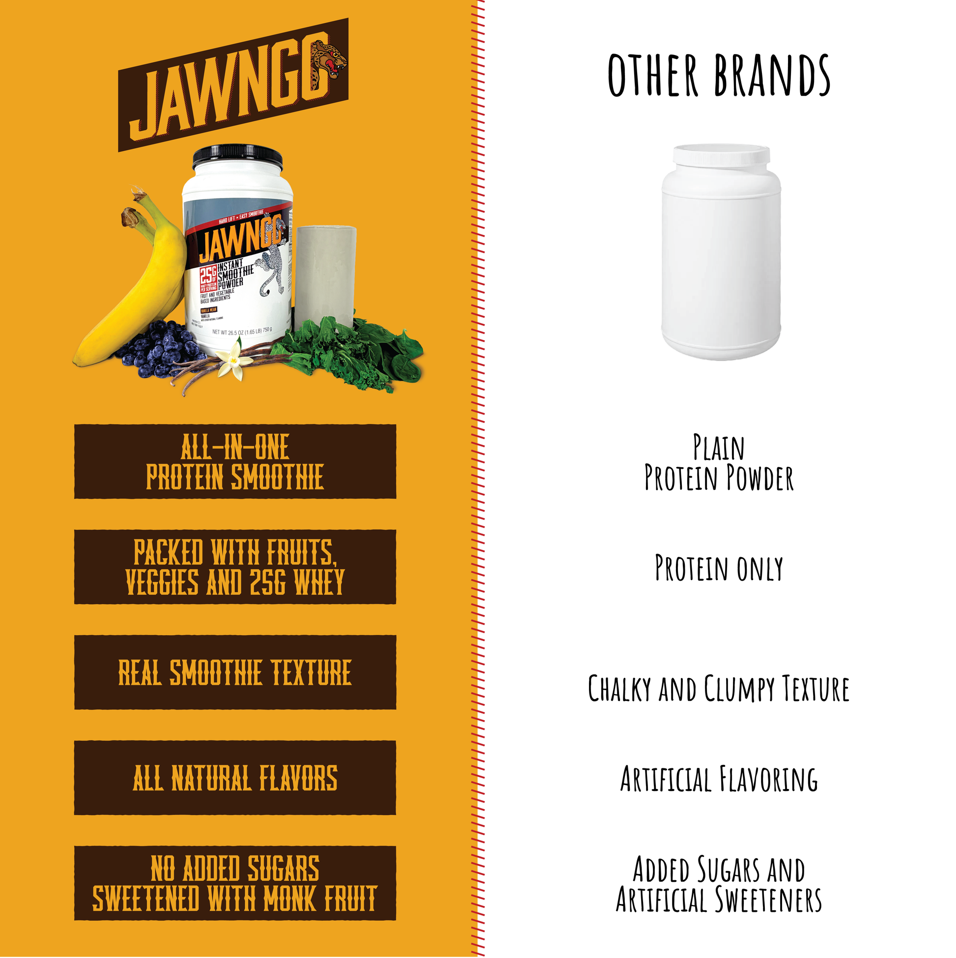 Jawngo smoothies are naturally sweetened with Monk Fruit. Not the high fructose stuff that makes you crash in a couple of hours.