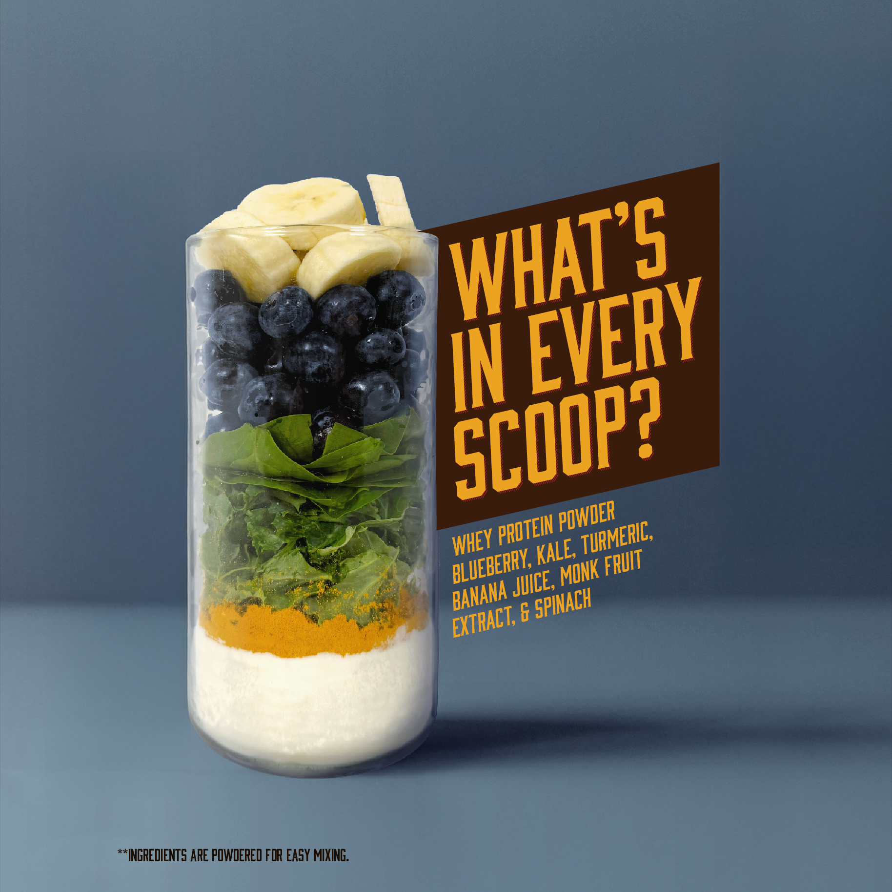 Ingredients: Whey Protein 25g, Blueberry, Banana Juice, Monk Fruit Extract, Kale, Spinach, Turmeric, Coconut Milk, Natural Flavoring